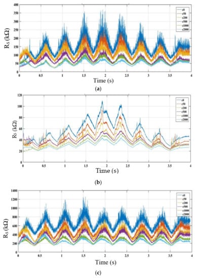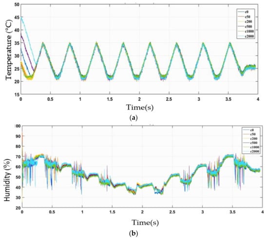 In this section, the plots of the sensors’ responses acquired based on the experimental setup described in Section 2.3 are presented. Two plot types (2D and 3D) were used to observe the gas sensor response. Figure 5 illustrates the pattern of the measured ambient temperature and humidity at ethanol solution concentrations of 0%, 0.05%, 0.2%, 0.5%, 1%, and 2%, which are indicated by c0, c50, c200, c500, c1000, and c2000, respectively. The temperature was controlled in the range of 16 °C to 30 °C, but the actual temperature was found to be between 20 °C and 35 °C because of the heat emitted from the sensor heater and mixing process. The humidity gradually decreased from 75% to 45% and then increased to 75%. In addition, the humidity plot had many spikes because the incubator had difficulty in controlling the level, which is leading to fast fluctuations at higher temperatures. Nevertheless, data filtering was not needed because the sensor response changes according to the spike and such an effort may significantly influence the reliability and accuracy of the data.
