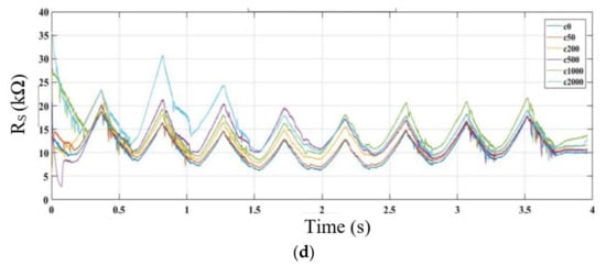 Two-dimensional plots of gas sensor response RS against time at different temperatures, humidity, and concentration levels of ethanol solution (c0, c50, c200, c500, c1000, and c2000): (a) MiCS-5524, (b) GM-402B, (c) GM-502B, and (d) MiCS-6814.
