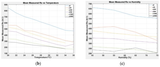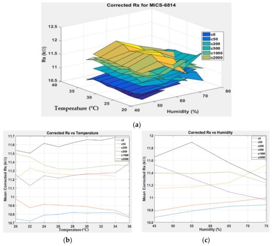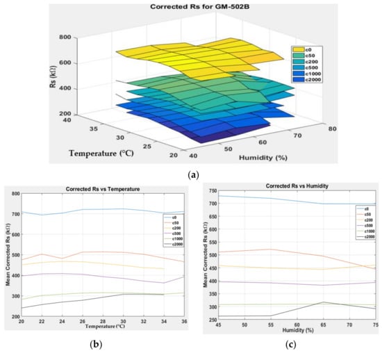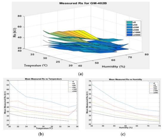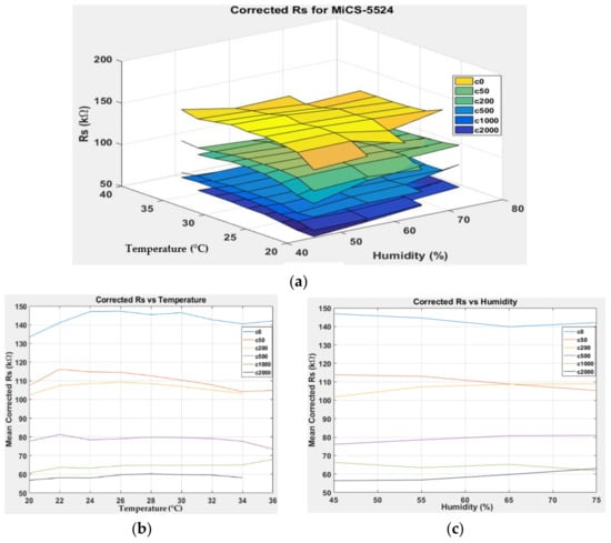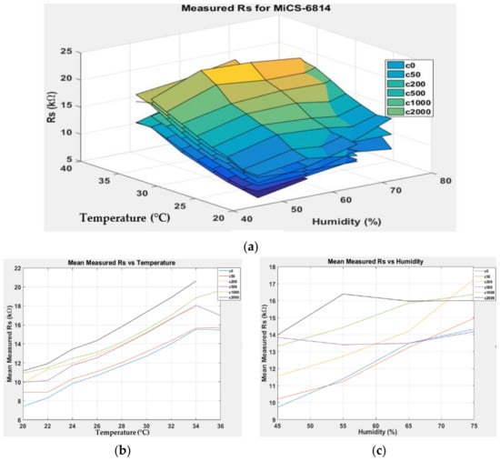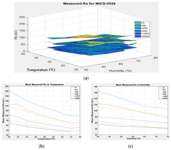 (a) Three-dimensional surface graph of MiCS-5524 measured RS at varying temperature and humidity levels and different ethanol solution concentrations, (b) mean of measured RS versus temperature, and (c) mean of measured RS versus humidity.