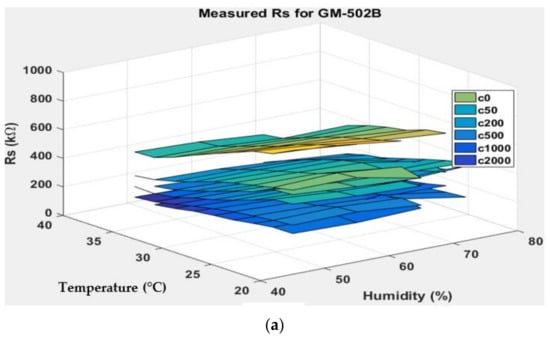 In this study, a gas sensor response model was created. Given , temperature, and humidity values, the model F can predict the corrected response that eliminates the drift resulting from temperature and humidity variations. This function is described in Equation (2),