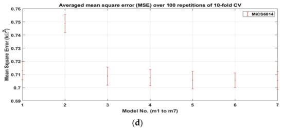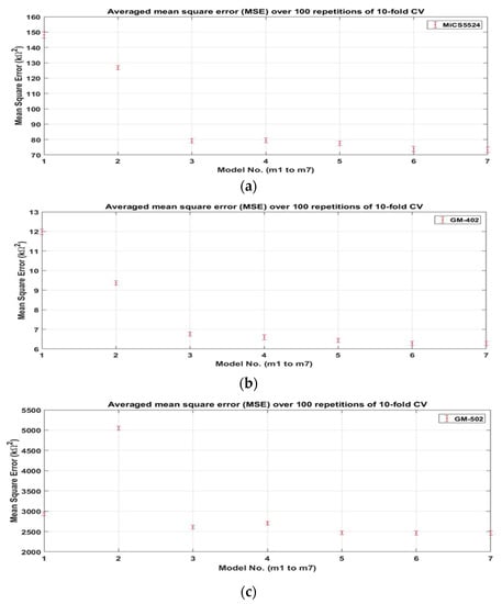 The k-fold cross-validation (CV) approach was utilised to evaluate the performance and provide a measure of fit, i.e., mean square error (MSE), to select candidate models for the dataset. The dataset was randomly divided into k equally sized subsamples in this approach. At every sample time, k − 1 subsample was gathered to form the training dataset, and the other subsample was used as the validation dataset. The procedure was repeated k times so that every k subsample was in a test set only once. Then, the entire k-fold process was repeated n times, with new randomly drawn subsamples. Finally, the MSEs were obtained from all the n repetitions, the k-folds were averaged, and the standard deviation was calculated. The technique has an advantage over the conventional testing method (e.g., dividing data into 70% for the training set and 30% for the test set) in that all samples are used for both training and testing. Therefore, more reliable results were obtained.