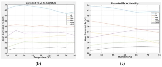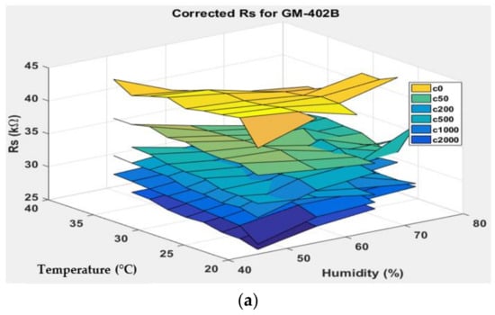 Figure 12, Figure 13, Figure 14 and Figure 15 show 3D surface plots of the corrected response for MiCS-5524, GM-402B, GM-502B, and MiCS-6814. The mean corrected responses with respect to temperature and humidity were also plotted to provide a clearer response pattern based on the temperature and humidity relation. The plots for , , and are flatter at varying temperatures and humidity than the plots in Figure 7, Figure 8, Figure 9 and Figure 10. This proves that the model can minimise the effects of temperature and humidity on the gas sensor response.