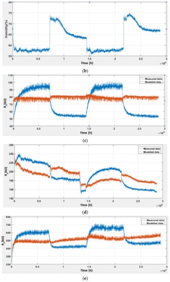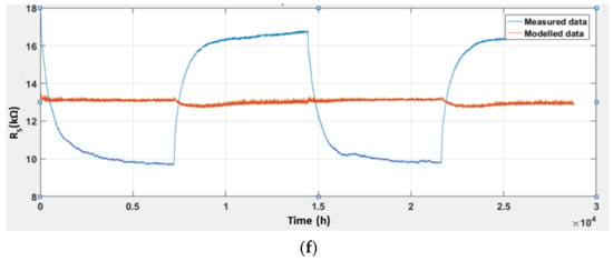 Temperature and humidity controlled using air conditioner: (a) Temperature (LM35); (b) humidity (HIH-5030); as well as measured and modelled sensor responses inside closed room using (c) MiCS-5524V2; (d) GM-402BV2; (e) GM-502BV2; and (f) MiCS-6814V2.