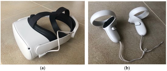 Wearable device used in the study. (a) HMD Oculus Quest 2 + Elite strap and (b) controllers.