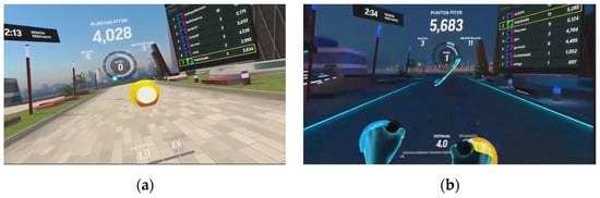 Screenshots of different scenarios of FIT-XR. (a) Balls to train upper limbs; (b) obstacles to train lower limbs.