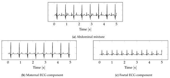 Non-invasive foetal electrocardiography (NI-FECG) is technologically similar to adult electrocardiography (ECG) [9]. Conventional ECG electrodes placed on the abdomen capture foetal cardiac activity. Figure 1a shows an example of a signal captured with NI-FECG. It is the sum of the maternal ECG (Figure 1b) and the foetal ECG (Figure 1c). It is impossible to measure either component individually using electrodes placed on the mother’s body, making it difficult to obtain a ground truth using non-invasive methods. CTG can be used as a reliable reference for the heart rate, but it does not provide the full signal. It is possible to capture the maternal ECG individually elsewhere on the body, but a simple subtraction of this signal from the abdominal mixture will not lead to the extraction of the FECG as the maternal component in the abdominal mixture is a non-linearly transformed version of the maternal ECG captured elsewhere on the body. The abdominal mixture is further corrupted by noise sources such as uterine and foetal movement. These noise sources are non-stationary, which often results in changing signal conditions throughout the recording. Signal quality is also dependent on the positioning of the foetus relative to the electrodes. Electrodes are typically placed in a way that covers a large area of the abdomen to increase the chances of capturing the foetal ECG in one of the leads. It is not uncommon for the foetus to move during a recording in such a way that causes the foetal component in the abdominal mixture to disappear entirely. These factors combined often result in a low and varying signal-to-noise ratio (SNR), making the extraction of FECG from the abdominal mixture a challenging task.