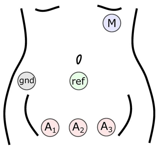 The NI-FECG recordings used in this work were obtained from a private retrospective dataset collected at Wuhan Children’s Hospital, Wuhan, China from 2014–2019. Recordings were taken as part of a routine prenatal screening with pregnancies at various gestational ages. Each record consists of 1 maternal chest channel and 3 abdominal channels. Recordings are variable in length and typically in the range of 1–3 min. The sample rate is 1 . Figure 2 shows the electrode configuration. The maternal chest lead (M) is placed over the 5th intercostal space on the left anterior axillary line (V5 position). The abdominal leads (, , ) are placed on the lower abdomen with the centre lead positioned over the pubic symphysis. The abdominal reference lead () is placed over the fundus of the uterus. An additional ground lead () is placed level with the reference lead on the right mid-axillary line.