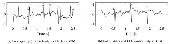 Examples of good- and bad-quality segments. Blue circle: maternal R peak, red cross: foetal R peak.