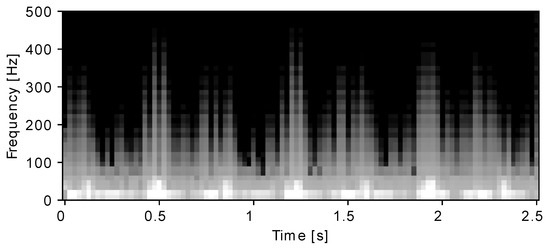 Each normalised channel was filtered with a 3rd order Butterworth bandpass filter with a passband of – to suppress the baseline drift and unwanted high-frequency noise. Bandpass filtering is a commonly used preprocessing step for NI-FECG [2,3,10,11,12], and the passband of – is the same as what was used in [31]. Recordings were then segmented into windows with overlap. A window length of was used, which yields segments that typically contain 4–6 foetal R peaks and 3–5 maternal R peaks, which is sufficient to measure the heart rate. After segmentation, the dataset consisted of 1212 good segments and 1251 bad segments for a total of 2463 (a segment contains the maternal channel and 3 abdominal channels). Using the short-time Fourier transform (STFT), each channel was converted into a two-dimensional (2D) time-frequency representation. An 80-point Fourier transform with an equal length Hamming window and a time-step of 25 were used. The output image has a dimension of 40 × 126, and its values were scaled to a standard greyscale range of [0, 128]. Figure 4 shows an example of a single-channel segment of NI-FECG (with a good-quality ground truth label). The large maternal R peaks are visible with the smaller foetal R peaks in between.