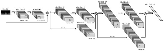 Figure 6 shows the detailed architecture of the CNN path for a single channel. It consists of 3 equal pairs of Conv2D layers (filter and kernel sizes are shown in the figure). To minimise the loss of gradients during back-propagation, bypass connections are placed around each pair of Conv2D layers. The input of each bypass connection is summed with the output of every second Conv2D layer, and the sum is used as the input for the next Conv2D layer. To match the shape of the bypass connection to the output it is being summed with, a Conv2D layer with kernel of 1 × 1 and a matched filter size is placed in the bypass path. The last layer is a fully connected layer with 24 neurons. The output of this layer is flattened and concatenated with the other channels’ output, as shown in Figure 5. The stride for all Conv2D layers in the network is 1 × 1, and the activation is ReLu. Batch normalisation is performed after each Conv2D layer (not shown in the figure). A diagram showing the full network overview can be found in Appendix A.
