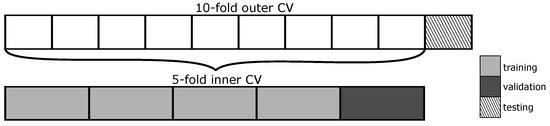 Nested 10-fold cross-validation (CV) was used for training and testing with a 5-fold inner CV for validation. Figure 7 illustrates the nested CV procedure. The entire dataset was first partitioned into 10 equally sized folds. Stratification was used to ensure an equal distribution of good and bad labelled data in each fold. The outer CV loop began by holding out one fold for testing while the remaining folds move on to the inner CV loop. The inner loop partitioned these data into 5 equally sized folds. One was held out for validation, and the remaining folds were used for training. The neural network was trained for 200 epochs with a batch size of 28 and evaluated on the validation fold at each epoch. The layer weights of the epoch with the highest area under the receiver operating curve (AUC) were stored. The inner loop repeated itself until each fold had been used for validation once, and the layer weights with the highest AUC out of the 5 training runs were selected and loaded into the model. The inner loop was exited and the testing fold held out by the outer CV loop is evaluated on the trained model. The performance on the test fold was stored and this concludes one iteration of the outer CV loop. The outer loop repeated itself 10 times, rotating the testing fold each time. To minimise possible bias introduced by the partitioning of the data, the outer CV was repeated 100 times with randomised folds. The final model performance score was obtained by averaging the test results over all iterations of the outer CV (1000 total).