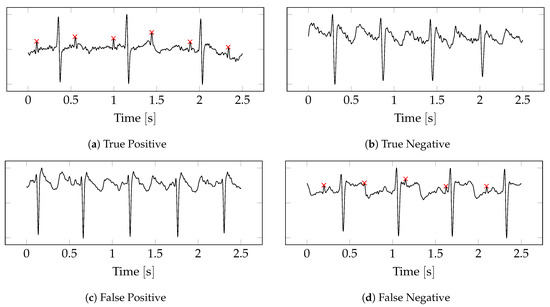 Figure 8 shows examples of true and false predictions (only the first abdominal channel is shown). Note that the good quality class is the positive label, and the bad quality is the negative label. For the True Positive (TP) case (Figure 8a), the foetal R peaks are easy distinguishable from the maternal signal. The True Negative (TN) case (Figure 8b) is similarly obvious. While the noisy component of the signal may contain the foetal ECG, it is indistinguishable by eye from the noise. The FP case (Figure 8c) appears to have been caused by the presence of several R peaks that appear to be of foetal origin. The position of the R peaks, however, cannot be clearly determined, and the segment was therefore given a ground truth label of bad. The FN is a borderline case (Figure 8d), and the model likely failed due to the low amplitude of the foetal R peaks. The segment has a ground truth label of good because the FHR can still be visually determined despite the low FECG amplitude.