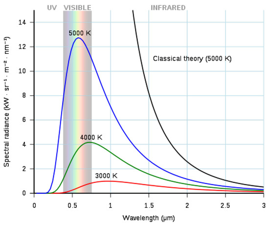 Infrared radiation or thermal radiation, which is part of the electromagnetic spectrum, is emitted by any object above the absolute zero temperature °C) [13,21]. Infrared radiation is temperature dependent [22]. The properties of this radiation are described by Planck’s law, which states that the spectral radiance of a perfect emitter (blackbody) is given by Equation (1) and Figure 1 [23].