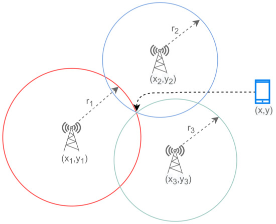 To determine the crowd density in a location, the data collected by GPS devices in the area are utilized. GPS positioning is based on trilateration, which is a technique for estimating position by measuring distances between points with known coordinates [27,28,29,30]. Trilateration calculations use the coordinates (longitude, latitude) of neighboring cell towers, as well as the estimated distance between the device and the cell towers, to determine the coordinates of a mobile device. Figure 3 shows the trilateration process used by GPS receivers.