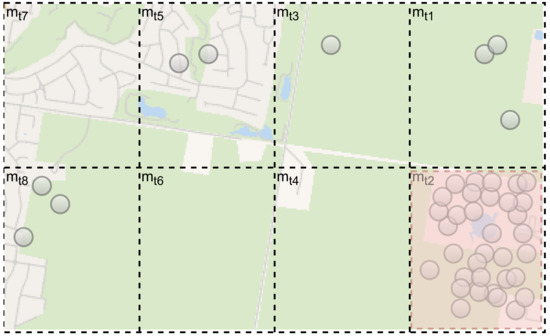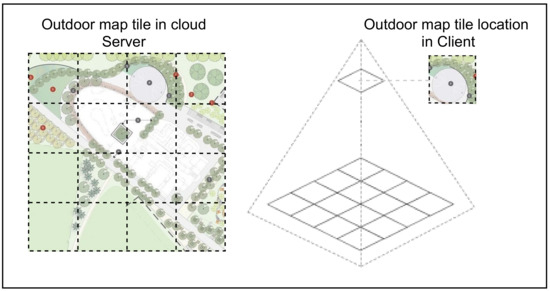 The outdoor map area O is divided into multiple map tiles (O = m, m, …, m; i = 1, …, n) where m indicates a specific map tile. Let S be the square area of an outdoor tile; then, the length of each tile is set to m S.