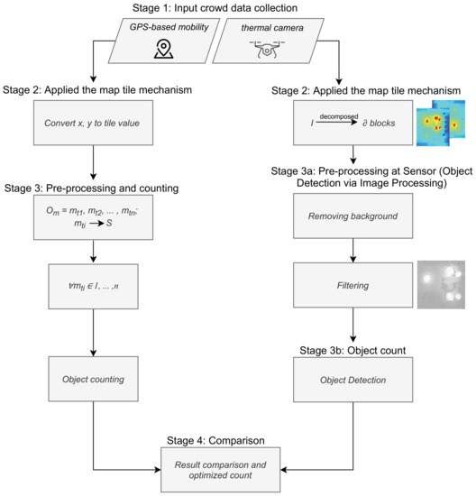 The proposed system consists of GPS-based mobility and thermal cameras that work together to compensate for each other’s main shortcomings. GPS-based mobility provides a low-cost and preserving solution for crowd tracking and monitoring. Based on captured GPS data, the system can count mobile devices in target tiles. Thermal cameras can provide higher accuracy and optimized counts based on precise near-ground truth. The key idea of the proposed cross-crowd detection approach is to form a database that stores the correlation between the number of people and density captured by GPS-based mobility and the number of people counted by the thermal camera with anomaly detection in GPS data. Both GPS-based detection and thermal camera counts are reported to the cloud, where data analytics modules reside. The analytical results are applied based on the correlation between the two data modalities.