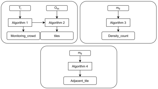 One of the properties of map tiles is that they can be represented differently at different scales. Because tile size varies, the calculation of crowd density usually depends on the tile size. In this study, a tiling map will divide the map into several tiles of a fixed size. Assume that the moving objects in a certain tile m have exceeded the allowed density based on Definition 5. The tile m will be “restricted” and no new objects should be allowed in until the tile has been “released”. The users’ devices located in the map tile m will receive an alarm message that the m has the maximum capacity of moving objects and is restricted. In addition, it identifies the moving objects that have spent a long time in that tile and advises them to exit or to move to a tile that has no restrictions. Furthermore, users within a certain radius around restricted tiles receive notifications of the crowd density status of each map tile. Figure 7 shows the model proposed in this study, which consists of multiple algorithms, each with a distinct objective. The intelligent monitoring of outdoor crowd density can be summarized as the pseudo-code shown in Algorithm 1. The outdoor map tile is shown in Algorithm 2. The density rule is shown in Algorithm 3, and the evaluation of the moving objects with time to exit or move to another tile is shown in Algorithm 4.