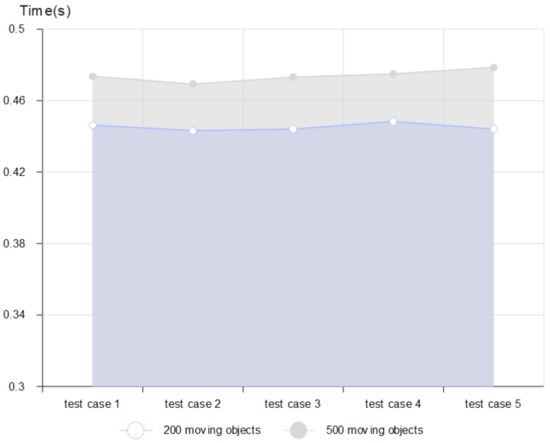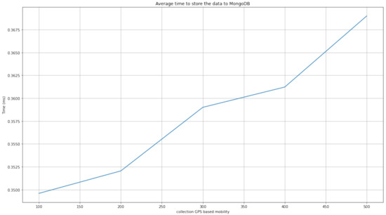 After the first phase in which the database was constructed, the GPS data of moving objects in our database were allocated to the corresponding map tile. Figure 9 shows the average time required to store the data to MongoDB from the moment that GPS-based mobility data were collected. We also evaluated the proposed method for the effective measurement of construction performance. We increased the number of moving objects and conducted random test cases of sufficient quantity to evaluate performance. Figure 10 show that the tile-map-based method for the intelligent monitoring of outdoor crowd density performs well. For example, the proposed model demonstrates a consistently stable and low response time in a test scenario which involves 500 moving objects.