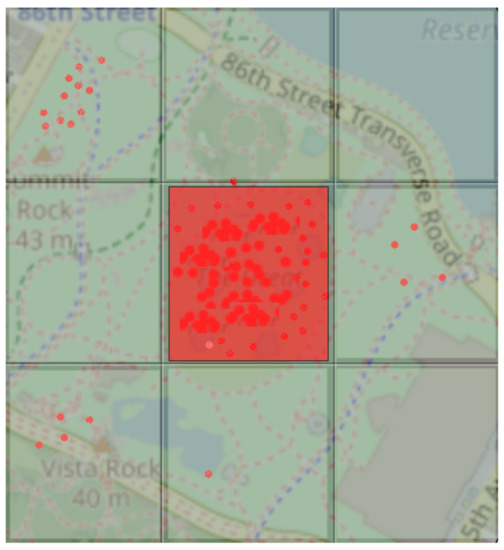 In this experiment, we used an actual outdoor environment: Central Park in New York City (Figure 8). We generated the GPS data of moving objects synthetically based on realistic scenarios at random locations within the park. Furthermore, before beginning the experiment, the outdoor map area O was divided into multiple map tiles (O = m, m, …, m; i = 1, …, n) and we set S, the square area of an outdoor tile, to m 500 m.
