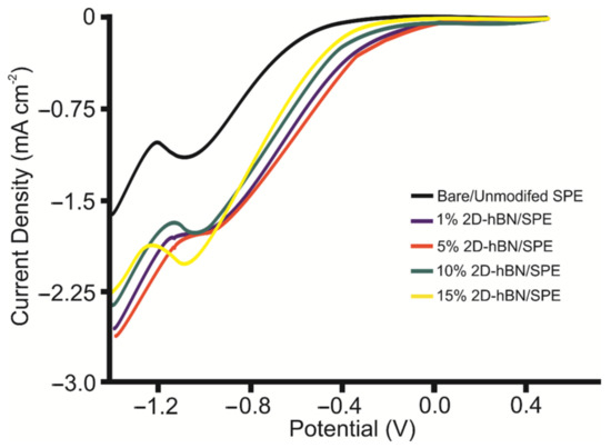 A is the electrode area; C is bulk the concentration of oxygen within the analyte under investigation (where in this case, a fully saturated acidic solution is reported to correspond to 0.9 mM [46,47]); is the scan rate; and D is the diffusion coefficient of O2, which has been reported to be 2.0 × 10−5 cm2 s−1. Equation (5) calculates “n” by introducing the recorded peak current “Ip” and other corresponding values (αn′ from Equation (4)). Consequently, for the unmodified SPEs and 1, 5, 10 and 15% 2D-hBN/SPEs, in all cases, n was calculated to be no greater than 2 and, therefore, indicate that the reduction of oxygen can follow the two-step two-electron peroxide pathway. These values confirm that the electrochemical reduction of oxygen using unmodified and 2D-hBN/SPEs preferentially drives the production of hydrogen peroxide (H2O2). Note that our previous work demonstrated that pristine 2D-hBN and surfactant exfoliated 2D-hBN followed the same two-electron pathway and produced H2O2. Furthermore, previous studies by Uosaki et al. [4] reported that 2D-hBN exhibited selectivity for the two-electron pathway at a gold substrate, and Jaramillo et al. [20] also reported that the interface of h-BN domains and graphene creates unique carbon-hBN domains that preferentially select a two-electron pathway for ORR. This is due to the material binding oxygen weakly, which tends to favour H2O2 production rather than H2O. Jaramillo et al. [20] supports this assertation via the employment of a density functional theory.