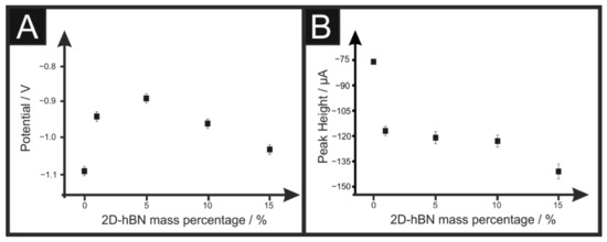 Analysis of voltammograms obtained in an oxygen saturated 0.1 M H2SO4 solution in the form of a plot of oxygen reduction peak potential vs. incorporated 2D-hBN % (A), peak potential vs. mass of pristine 2D-hBN/SPEs and (B) peak current vs. mass of pristine 2D-hBN/SPEs, recorded in oxygen saturated 0.1 M H2SO4. Scan rate: 100 mV s−1 (vs. SCE); n = 3.
