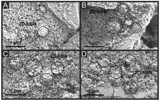 Typical scanning electron micrographs for SPE with 1% 2D-hBN (A), 5% 2D-hBN (B), 10% 2D-hBN (C) and 15% 2D-hBN (D). 2D-hBN platelets are evident as layered disk-like stacked vertical heterostructures of ca. 200 nm in size.