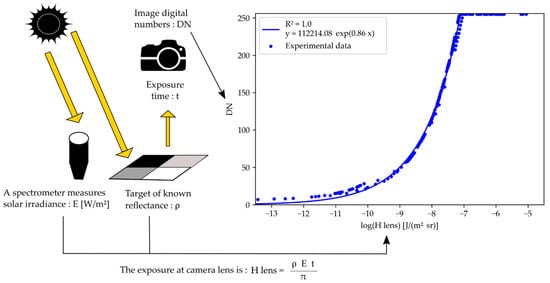 Figure 1. Method to build a camera response curve linking the image digital numbers and the exposure at camera lens. The curve used as example is the response curve of the 490 nm camera.