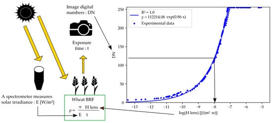 Figure 2. Method to compute wheat bi-directional reflectance factor (BRF) from image digital numbers and ILS readings. The method exploits the camera response curve. H lens is the exposure at camera lens.