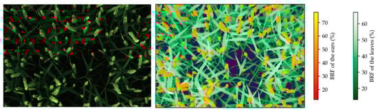 The second segmentation step, when ears were in the imaged scene, was used to separate the ears and the rest of the image. That segmentation was performed using the deep learning approach detailed by [56]. First, the YOLOv5 model (DOI: 10.5281/zenodo.3908559, accessed on 13 November 2021) detected the ear bounding boxes. Second, the DeepMAC model [57] segmented the ears in the bounding boxes. Once the ears, leaves, and background were separated, their masks were applied on the BRF maps to extract BRF values for the different wheat organs. An example of segmented BRF map is presented in Figure 3.