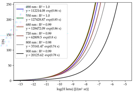 Figure 4. Response curves of the monochrome cameras. Each camera is designated using the central wavelength of the narrow-band optical filter. The response curves model the relation between image digital numbers (DNs) and exposure at camera lens ( H lens ).