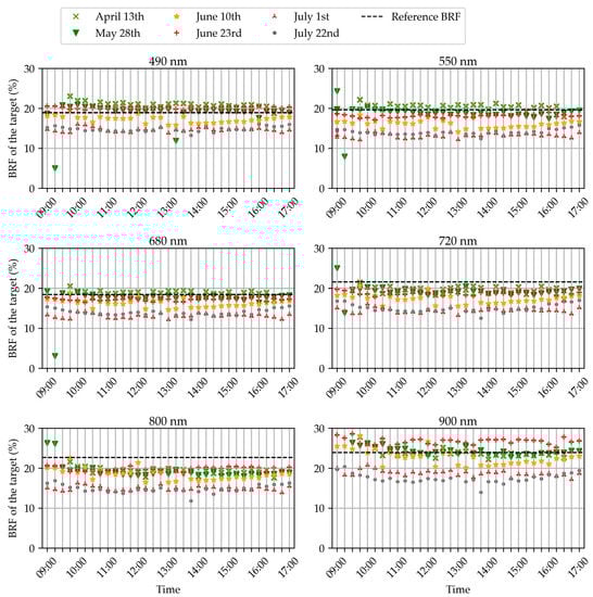 Figure 5 presents the evolution of the BRF measured throughout the day on the dark gray reference target. The evolution was studied for the six filters and the six all-day-long acquisition dates.