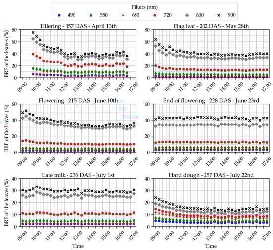 Figure 6. Evolution throughout the day of the average bi-directional reflectance factor (BRF) measured on the leaves. Each subplot is dedicated to an acquisition date, designated by the development stage of the crop and the number of days after sowing (DAS). The evolution of the measured BRF is represented for the six different optical filters of the cameras, indicated by a color and symbol code on each subplot.