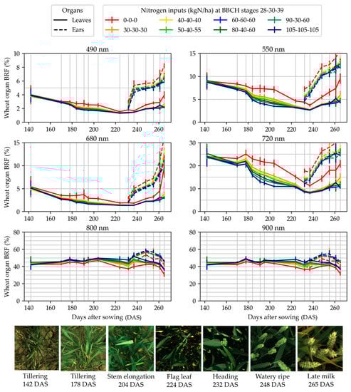 Figure 7 and Figure 8 present the dynamics of the average BRF measured in the fertilization trials and corrected using the BRF of the reference panel measured at the beginning and the end of the acquisition. For both trials, the curves show a coherent evolution, i.e., the points could be distributed on a smooth line. The same trends were observed for all the fertilization objects and the BRF values stratified along with the fertilization level. Those elements validate the consistency of the method. In Figure 7, a suspected increase in BRF can be observed for the 105-105-105 kgN/ha fertilization object at 261 days after sowing (DAS) for the visible and red edge wavebands. This spike is probably due to the mass lodging on the micro-plots of that fertilization object. Almost all the plants were lying on the ground, so the images had to be taken in the borders of the micro-plots, where their nutrition and development could have been different. Some plants were also tilted in those images.