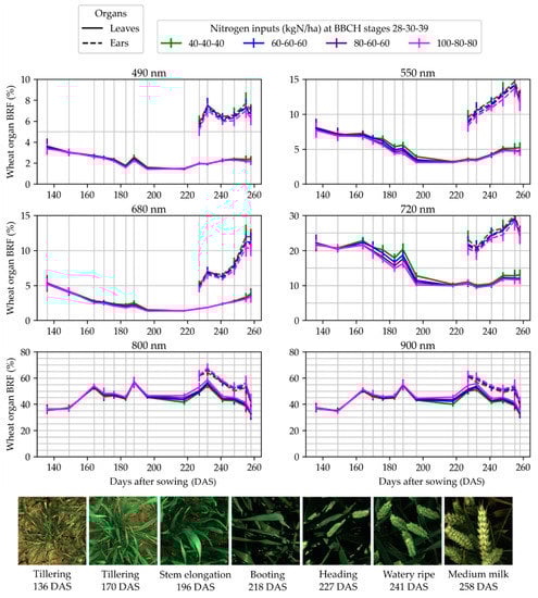 The results from Section 3.2 and Section 3.3 indicate that the computed wheat BRF values were comparable within the same date if the sun was high enough or if the sky was cloudy. However, different dates presented slight variations in absolute BRF values, probably because of the configuration of the acquisition system. To deal with this effect, the values of the dark gray target on the reference panel were used to correct the wheat organ average BRF. Each wheat BRF value was multiplied by the ratio of the BRF measured on the target at this date to the theoretical reference BRF of the target. In this multiplication factor, the BRF measured on the target was the mean of the values measured at the beginning and the end of the acquisition of all wheat micro-plots. In the rare cases where the difference between the BRF of the target at the beginning and at the end was larger than 3%, only the value closest to the theoretical BRF was considered. The furthest value was considered to be unreliable. The difference of reference BRF values within a same date were probably due to the positioning of the panel in the field. Less care was used during this step than in the all-day-long experiments. Here, the reference panel was held by human hands or dropped above the canopy. The two parts of the open suitcase containing the panel and the ArUco marker for panel segmentation could have been folded, modifying the relative position of the panel and the marker, thus the leading to a panel segmentation error. A wheat leaf could also have been moved above the panel at the time of acquisition.