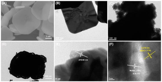 (A) SEM image of BiOCl. (B–D) TEM images of (B) BiOCl, (C) MoSe2, and (D) BiOCl/MoSe2-30. (E,F) HR-TEM images of BiOCl/MoSe2-30.