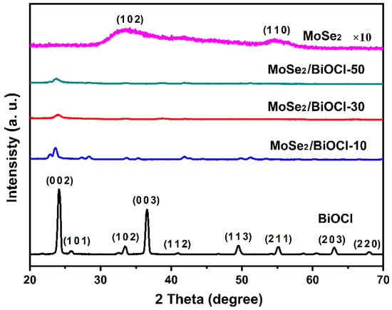 The crystalline structures of the synthesized samples were analyzed by X-ray diffraction patterns (XRD). As shown in Figure 2, BiOCl presents the diffraction peaks at 2θ = 24.1°, 25.9°, 33.4°, 36.5°, 40.9°, 49.7°, 54.1°, 63.1°, and 68.1°, attributed to BiOCl (0 0 2), (1 0 1), (1 0 2), (0 0 3), (1 1 2), (1 1 3), (2 1 1), (2 0 3), and (2 2 0) crystal planes, respectively (JCPDS No. 06-0249) [54]. In contrast, BiOCl/MoSe2-10, BiOCl/MoSe2-30, and BiOCl/MoSe2-50 exhibit an obvious diffraction peak at 24.1°, while the other characteristic peaks become very weak, due to the resistance of the thick MoSe2 shell layer to X-ray. Even enlarged 10 times in intensity, the diffraction peaks of MoSe2 (1 0 2) and (1 1 0) are still very weak and broad, which is probably ascribable to both its low crystallinity as well as the very thin sheet structure.