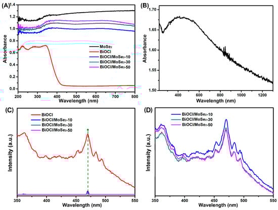 (A) UV−Vis DRS spectra of MoSe2, BiOCl, BiOCl/MoSe2-10, BiOCl/MoSe2-30, and BiOCl/MoSe2-50 in the UV and visible light region. (B) DRS spectra of MoSe2 in the UV, visible light, and NIR region. (C) PL spectra of BiOCl, BiOCl/MoSe2-10, BiOCl/MoSe2-30, and BiOCl/MoSe2-50. (D) Enhanced PL spectra of BiOCl/MoSe2-10, BiOCl/MoSe2-30, and BiOCl/MoSe2-50.