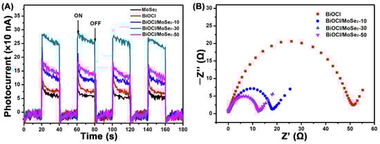 (A) Transient photocurrents of MoSe2, BiOCl, BiOCl/MoSe2-10, BiOCl/MoSe2-30, and BiOCl/MoSe2-50 under simulated sunlight irradiation; (B) Nyquist plots of the electrochemical impedance spectra of BiOCl, BiOCl/MoSe2-10, BiOCl/MoSe2-30, and BiOCl/MoSe2-50.