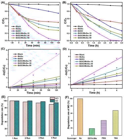 Figure 5A,B presents the degradation curves of MO and SD over the different photocatalysts under simulated sunlight irradiation, respectively. In the absence of photocatalyst, the concentrations of MO and SD almost have no change under simulated sunlight irradiation, indicating that they have high photostability. Both pure BiOCl and MoSe2 exhibit low photocatalytic activity for MO and SD degradation, which is because BiOCl cannot respond to visible light while MoSe2 has the high recombination rate of photogenerated electrons and holes. Compared to pure MoSe2 and BiOCl, all the BiOCl/MoSe2 samples show evidently enhanced photocatalytic activity for MO and SD degradation, because the heterojunction structure between MoSe2 and BiOCl can effectively restrain the recombination of photogenerated electrons and holes. To more accurately compare the photocatalytic activities of BiOCl and the different BiOCl/MoSe2 samples, we further fitted the kinetic curves of MO and SD degradations over these samples. From Figure 5C,D, it can be seen that the degradations of MO and SD over these photocatalysts follow the pseudo first-order kinetic reaction. By comparing the reaction kinetic constants in Table 1, we know that BiOCl/MoSe2-30 possesses the highest photocatalytic activity among all the samples.