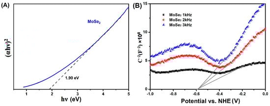 where h, α, ν, A, and Eg are the Planck constant, absorption coefficient, light frequency, constant value, and bandgap energy, respectively. As shown in Figure 6A, the bandgap energy of MoSe2 was estimated to be 1.9 eV, similar to the value of the previous reports [52,65,66]. Then, the potential of MoSe2 CB edge was determined by Mott–Schottky analysis [67]. As shown in Figure 6B, the potential of MoSe2 CB (ECB) was estimated using the extrapolation of the Mott–Schottky plots at different frequencies (1 kHz, 2 kHz, and 3 kHz) to be −0.59 V (vs. NHE). According to the equation of EVB = ECB + Eg (EVB is the potential of VB), the potential of MoSe2 VB was further calculated to be 1.31 eV.