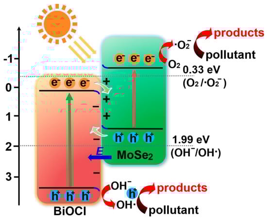 Based on the above experimental results and analyses, the degradation mechanism of organic pollutants over S-scheme BiOCl/MoSe2 was proposed: As illustrated in Figure 7, under simulated sunlight irradiation, both BiOCl and MoSe2 can produce holes on their VB and electrons on their CB. Using the acceleration of internal electric field, the photogenerated electrons on BiOCl CB and the holes on MoSe2 would be recombined. As a result, the powerful electrons on MoSe2 CB and the powerful holes on BiOCl VB would be reserved. Subsequently, the electrons on MoSe2 CB would react with adsorbed O2 to form •O2−. Meanwhile, some holes on the BiOCl VB would oxidize OH− to produce •OH. All of •O2−, •OH, and h+ take part in the degradation of organic pollutants.