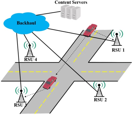 In the existing vehicular networks, each vehicle has its own on-board units (OBUs) so that it has a wireless networking function and can be provided content via the nearest roadside unit (RSU). The vehicles can connect with RSUs through vehicle-to-infrastructure (V2I) communication. The vehicles send their interests to obtain requested contents; then the RSUs could relay the requested contents provided from the remote content server(s). In the communication between the vehicles and the RSUs, the networks should support mobility as the vehicles are moving continuously and requesting a seamless content service. In other words, the requester vehicle should be provided contents from RSUs continuously. In spite of supporting mobility, the delay in receiving data from the RSU could increase when a vehicle sends a request for content because of a disconnection or moving to a new location before receiving the requested content. For the continuously moving vehicle, in-network caching has been considered an attractive approach for the CCVNs. It has two approaches to cache data in the networks: reactive and proactive approaches. In the reactive approach [5,6], if the requester vehicle disconnects from a current RSU, the RSU keeps caching content for the interest of the vehicle. When the vehicle reconnects to another new RSU, it informs the identity of the previous RSU to the new RSU for connection between the two RSUs. The new RSU requests the content being cached in the previous RSU. This approach also has the disadvantage of increased delay for the new RSU to start to transfer the contents to the vehicle.