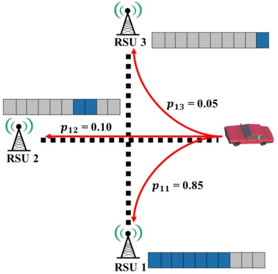 With the given example p = {0.85, 0.10, 0.05}, the entropy H is −0.85 × log0.85 − 0.10 × log0.10 − 0.05 × log0.05 ≈ 0.748. If the probability value is incorrect, caching is performed with a weight value for the most visited RSUs. As shown in Table 3, when the entropy value of exceeds 0.5, adds the smallest probability of to of the most visited RSU when calculating . After that, determines the content chunk number of . The transition probability in Figure 3 will exceed 0.5 when the entropy value is calculated. Since is the most visited RSU, weighting is recalculated to perform more accurate caching. After recalculation, the entropy becomes −0.9 × log0.9 − 0.1 × log0.1 ≈ 0.469 < 0.5.