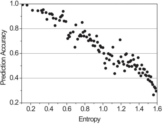 When the entropy value exceeds 0.5, it is estimated to be an inaccurate prediction. To support our use of entropy value as an inaccuracy, we simulated the correlation between prediction accuracy and entropy. The accuracy of the probabilities was calculated by setting success as if the vehicle had moved to the highest probability and fail if not. Figure 3 shows a graph of the accuracy measured according to the direction of the transition probability of the vehicle when the entropy value varies from 0.1 to 1.6. As a result, higher entropy means a lower prediction accuracy. In addition, When the prediction accuracy is greater than 90%, the entropy does not exceed 0.5.