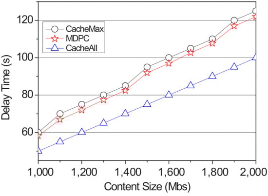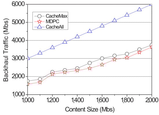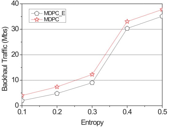 Figure 10 and Figure 11 show a graph of the backhaul traffic and delay time of the MDPC and the MDPC_E. It increased entropy from 0.1 to 1.6 by fixing its content size at 2500 Mb, measuring delay time and backhaul traffic.