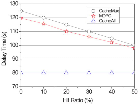 We vary the hit ratio from 0% to 50% by 10%. In this simulation, the hit ratio could be defined as the probability to move to the highest RSU. In other words, that means the ratio that the prediction is successful. Figure 7 presents the delay time according to the hit ratio. CacheAll has a constant result because it does not exploit the transition probability and caches content chunks to all RSUs. However, in the comparison between the CacheMax and the proposed strategy, if the prediction in CacheMax fails, it requires additional delay for requesting and receiving the missing contents to the content server. On the other hand, in the proposed strategy, even if the hit rate is low, the content is cached in proportion to the transition probability, so even if a cache miss occurs, the recovery time could be reduced rather than the other schemes as our strategy could get the missing content chunks from the adjacent RSU based on the content distribution information.