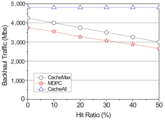 Figure 6 shows the backhaul traffic on the networks with the proposed strategy and the two schemes. The goal of ICN and proactive caching is to reduce content server traffic. Backhaul traffic considered the traffic generated when transmitting content from the content server to the RSU and the traffic generated when receiving content from the RSU. Although traffic does not occur because the content is not received by the neighbor RSUs in the case of the CacheAll, the traffic volume becomes largest because the content server must generate the traffic for all the contents to all RSUs. In the case of CacheMax, when the content is received by the content server, the same amount of content as the proposal is transmitted. However, when the prediction fails, the traffic volume increases because the entire amount of cached content must be transmitted from the server to the corresponding RSU through the backhaul network. However, in the case of our strategy, the cached content is distributed to all the neighbor RSUs in proportion to the transition probability of movement, so even if a cache miss occurs, the amount of content transmitted through the backhaul becomes smaller than that of the CacheMax.