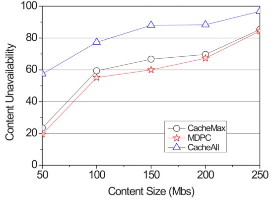 Content should be cached efficiently due to the limited storage space of the RSUs. To measure the content availability, we have more request vehicles in the networks. The 63 vehicles send a content request message for storage availability. When a car sends a content request message, the RSU is defined as a hit when caching can be performed compared to the content request size contained in its content storage and content request message. Figure 9 shows the storage failure in accordance with the size of the content. In such a case, content storage quickly dropped when the vehicle sent a content request a message to cache content to all RSUs. Additionally, in the case of CacheMax, although the content is cached to the most probable RSUs when the vehicles move while the car moves when the vehicles gather to the cached RSUs, the storage falls immediately. However, since the proposed strategy distributes and caches contents to the adjacent RSUs, it could support more vehicles and contents.