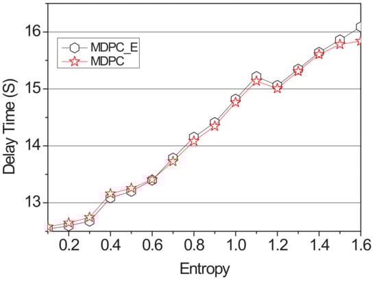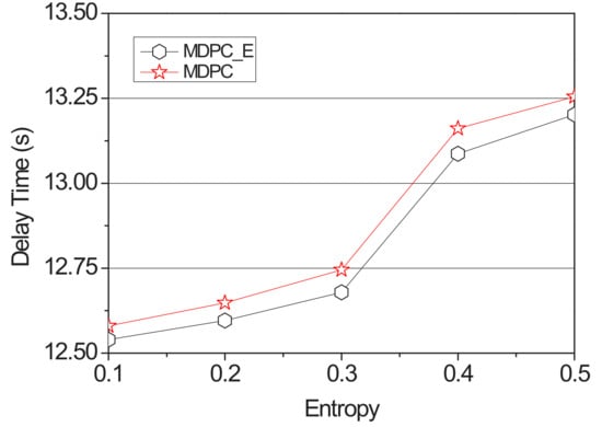 Figure 13 shows a graph of the delay time measured with the entropy value from 0.1 to 1.6. When the entropy value is 0.6, MDPC and MDPC_E backhaul traffic is almost the same. When the entropy value is 0.6, the backhaul traffic of MDPC and MDPC_E becomes almost the same. However, when the entropy value is 0.6 or more, the accuracy of the probability is reduced, and the possibility of the vehicle visiting the RSU having the highest probability is reduced. Therefore, if the entropy is 0.6 or higher, the backhaul traffic of MDPC is higher than the backhaul traffic of MDPC_E.