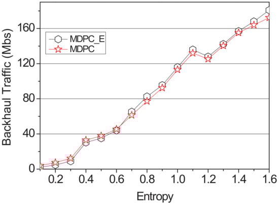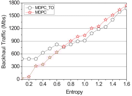 Figure 16 shows a comparison of the backhaul traffic between MPDC and MPDC_TO according to the entropy value. The simulation used the random value function of NS-3 to distribute the transition probability. Additionally, the content size is fixed to 2500 Mb, and the simulation is performed. The entropy value was measured using Formula (4) and increased by 0.1 from the minimum value of 0.1 to the maximum value of 1.6 in the range to measure backhaul traffic. MDPC_TO does not have the entry value applied to the objective function, so when the entry value is low, backhaul traffic is higher than MDPC. However, backhaul traffic of MDPC_TO and MDPC gradually becomes similar in 0.7 sections, which are about 80% accurate, and the difference becomes larger until it reaches 1.6. In the case of MDPC_TO, the content size to be cached in RSU is fixed. When the content size to be pre-cached is calculated by an MDPC strategy, the entropy value is about 0.8. Therefore, the difference is increased from the section of 0.8 or more.